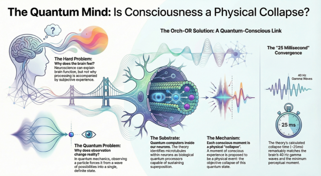 Eugene Wigner pushed it further with his famous friend-in-a-lab paradox. Your friend measures a quantum event inside a sealed room and sees, say, “spin up.” From outside, you must describe the entire lab (friend included) as being in superposition: friend-sees-up AND friend-sees-down. Only when you open the door and ask does reality snap into one version—for you. So whose consciousness triggered the collapse? Your friend’s… or yours? Both answers are mind-bending. Reality becomes observer-dependent in a chained, almost recursive way. Now layer on the biggest mystery in all of science: the hard problem of consciousness. We can map every neuron firing, every network buzzing—but why does any of it feel like something? Why is there an “inside” view at all? Computers crush chess, write poetry, recognize faces—yet show zero evidence of inner experience. If classical computation can’t produce qualia (the redness of red, the sting of pain), maybe consciousness isn’t classical. Enter Roger Penrose and Stuart Hameroff with their audacious Orch-OR theory (Orchestrated Objective Reduction).Penrose, using Gödel’s incompleteness theorems, argued human insight transcends algorithms. We see truths no formal system can prove mechanically. Therefore, understanding isn’t computable. The brain must be doing something non-classical—something quantum. But not random noise. Penrose proposed objective reduction: when a mass exists in superposition (two places at once), it warps spacetime in two incompatible ways. Gravity hates the contradiction. Beyond a tiny threshold, the superposition self-destructs—collapsing objectively, no observer required. Each collapse = one discrete “now” of conscious experience. Hameroff found the hardware: microtubules—tiny protein tubes inside every neuron. Anesthetics erase consciousness by messing with microtubules, not synapses. Their crystal-like lattice could, in theory, host coherent quantum states. Together: microtubules run quantum computations → neural activity orchestrates them → gravity triggers objective collapse → each collapse births a moment of “I am aware.” Roughly 40 times per second. That rhythm matches the brain’s gamma waves—and suddenly the seamless flow of experience starts making sense.