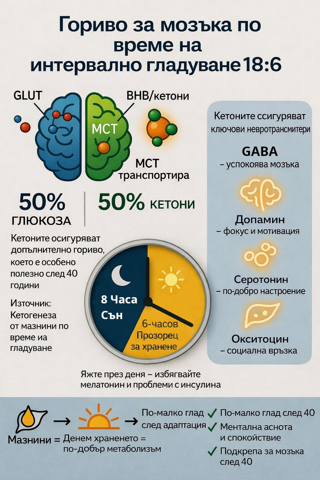 Общи ефекти върху настроението: 18:6 – кетозата надеждно намаляват симптомите на депресия и тревожност в изследванията (чрез GABA, BDNF, стабилно гориво, избягване на глюкозни кризи и анти-възпалителни ефекти). Хората често докладват умствена яснота и фокус след адаптация ~1–2 седмици, с изчезване на глада и „забравяне“ на храната. Това съответства на данните за 18:6 гладуване.