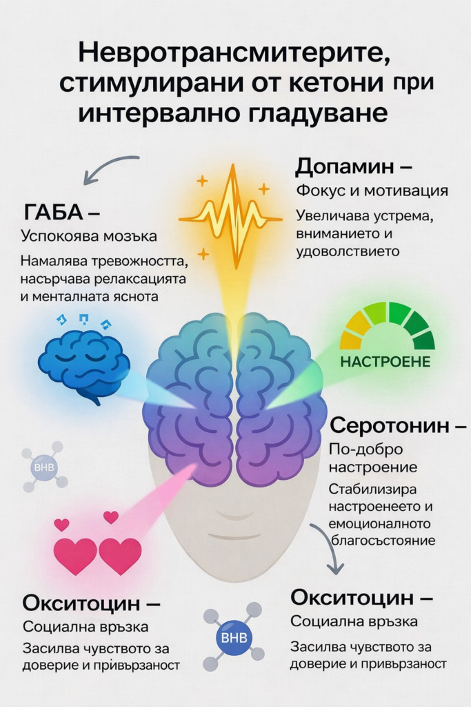 - GABA (основен „успокояващ“ невротрансмитер): Gamma-Aminobutyric Acid (гама аминомаслена киселина) е непротеиногенна аминокиселина, която служи като основен инхибиторен невротрансмитер в зрялата централна нервна система (ЦНС) на бозайниците, регулирайки невронната възбудимост чрез хиперполяризиране на постсинаптичните неврони. Най-убедителните доказателства: Кетоните изместват баланса глутамат/GABA към повече синтез и активност на GABA. Това намалява възбудимостта (анти-тревожни, анти-епилептични ефекти — кетогенните диети лекуват епилепсия отчасти чрез това). BHB повишава GABA; (BHB е съкращение от β-хидроксибутират, също изписван като бета-хидроксибутират). Това е основното кетоново тяло, произвеждано от черния дроб по време на периоди на ниска наличност на въглехидрати, продължително гладуване или кетогенни състояния. BHB не е просто източник на енергия – това е мощна сигнализираща молекула, която пряко влияе върху метаболизма, възпалението, генната експресия и мозъчната функция). Гладуването/кетозата усилва инхибиторната сигнализация, което обяснява „странното усещане за спокойствие, яснота и фокус“ след началния глад. Изследвания върху хора и животни го потвърждават при 18:6 гладуване и кетоза.