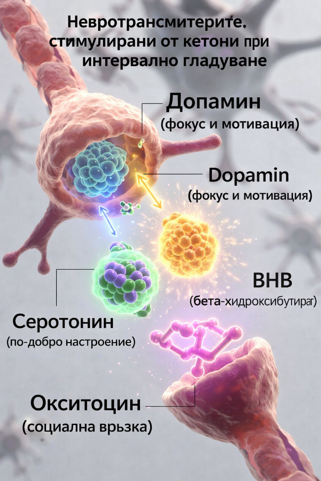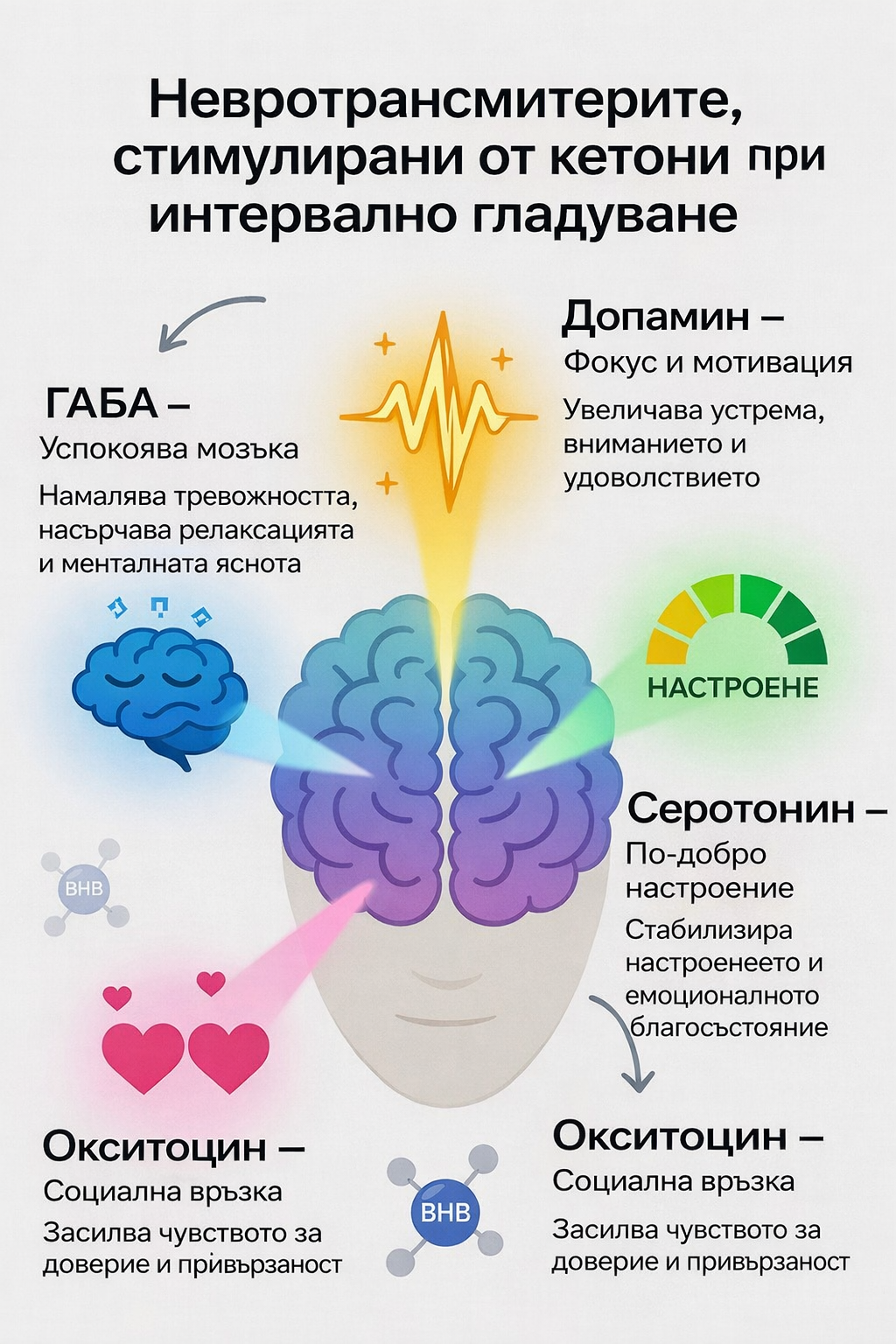 - Окситоцин: по-малко директни доказателства. Има някои изследвания, които показват, че кетоните конкретно „стимулират“ окситоцина (хормона на „връзката/привързаността“). Ползите за настроението/социалните функции при кетоза по-скоро идват от общите промени в GABA/допамин, намалена тревожност и стабилна енергия, която позволява по-добро социално функциониране. Взаимодействия допамин-окситоцин съществуват, но не са толкова свързани с кетони.